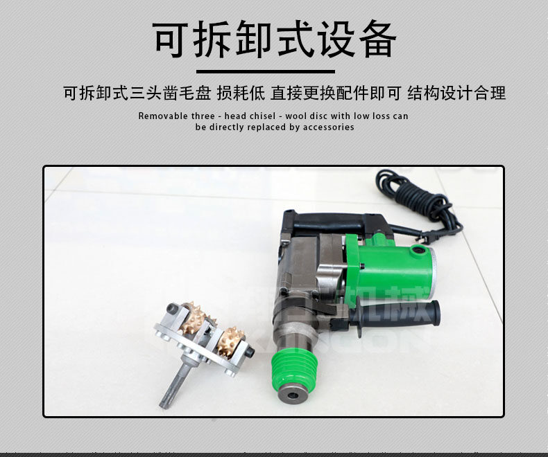 電動手持式鑿毛機 金剛石三頭鑿毛設(shè)備 小型水泥路面拉毛機。該鑿毛機型主要應(yīng)用于高鐵、高速公路橋面、隧道、水利水電、核電、市政道橋、大型集裝箱場地、停車場、室內(nèi)外混凝土地面翻新除險加固等混凝土面層鑿毛工程