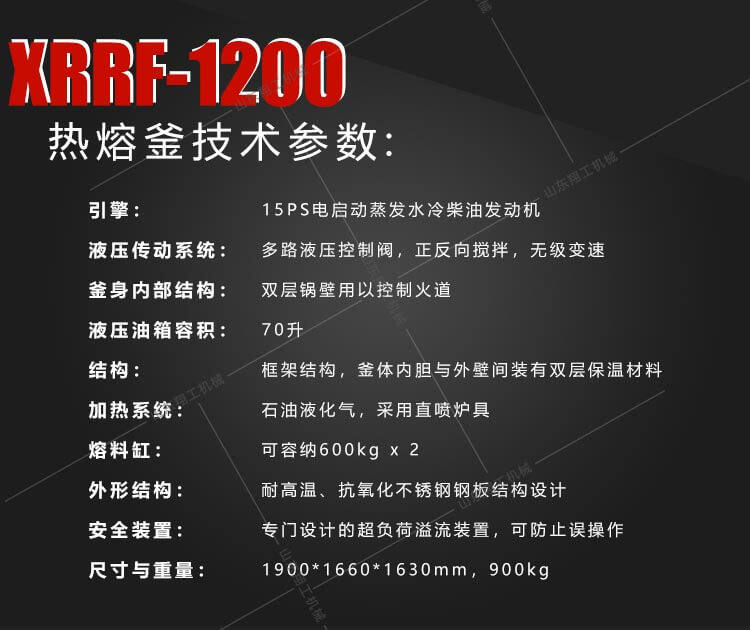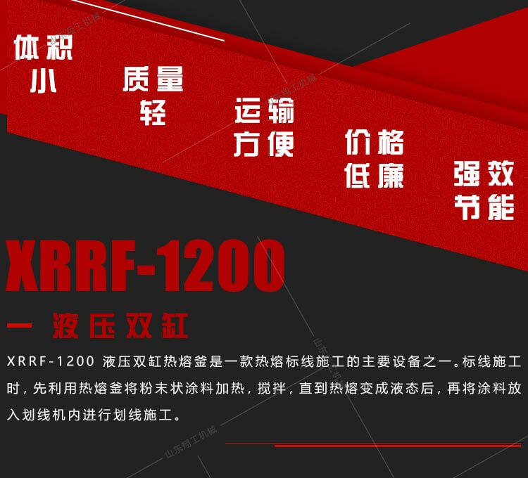 XG1200液壓雙缸熱熔釜是一款熱熔標線施工的主要設備之一。標線施工時,先利用熱熔釜將粉末狀涂料加熱,攪拌,直到熱熔變成液態(tài)后,再將涂料放入劃線機內進行劃線施工。由于涂料的融化質量直接關系到標線質量,因此熱熔釜是熱熔標線設備的關鍵部件,是涂料的融化必不可少的部分。