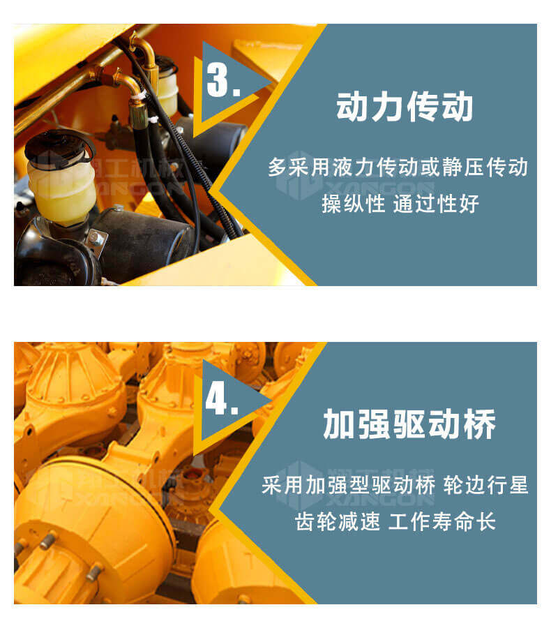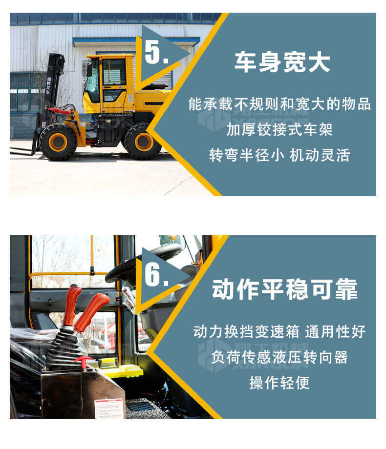 5.越野叉車發(fā)動機功率大,采用全輪驅動和越野輪胎。