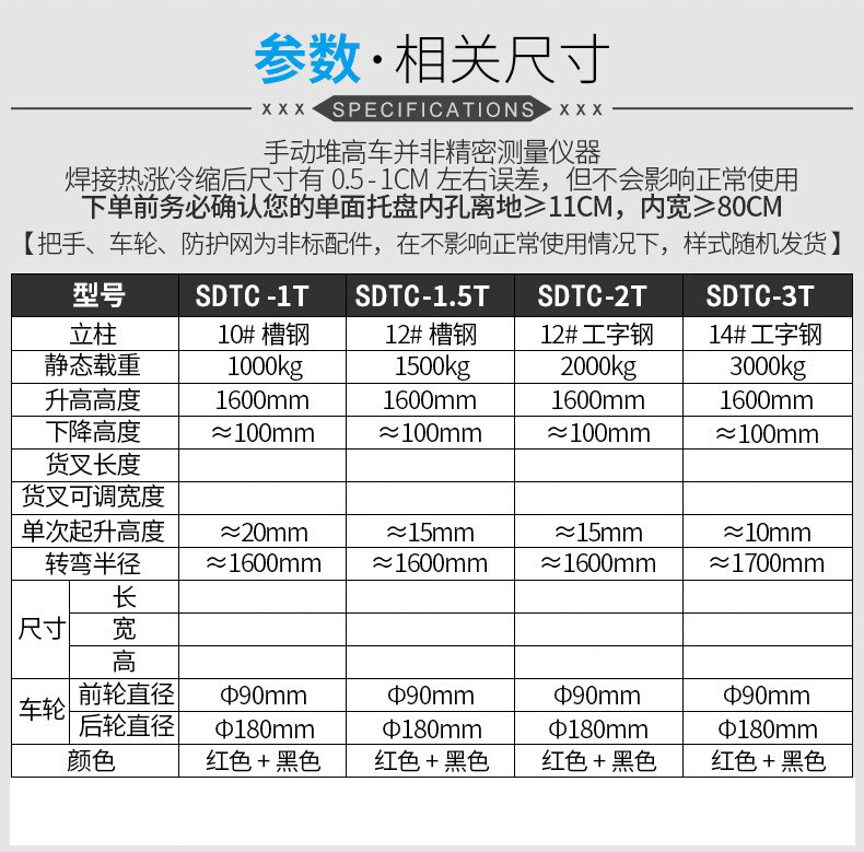 10、可腳踩或手搖兩種方式,控制貨叉起升高度,1.6米、1.8米、2米、3米、3.5米等多種規(guī)格,自由掌控升高;
