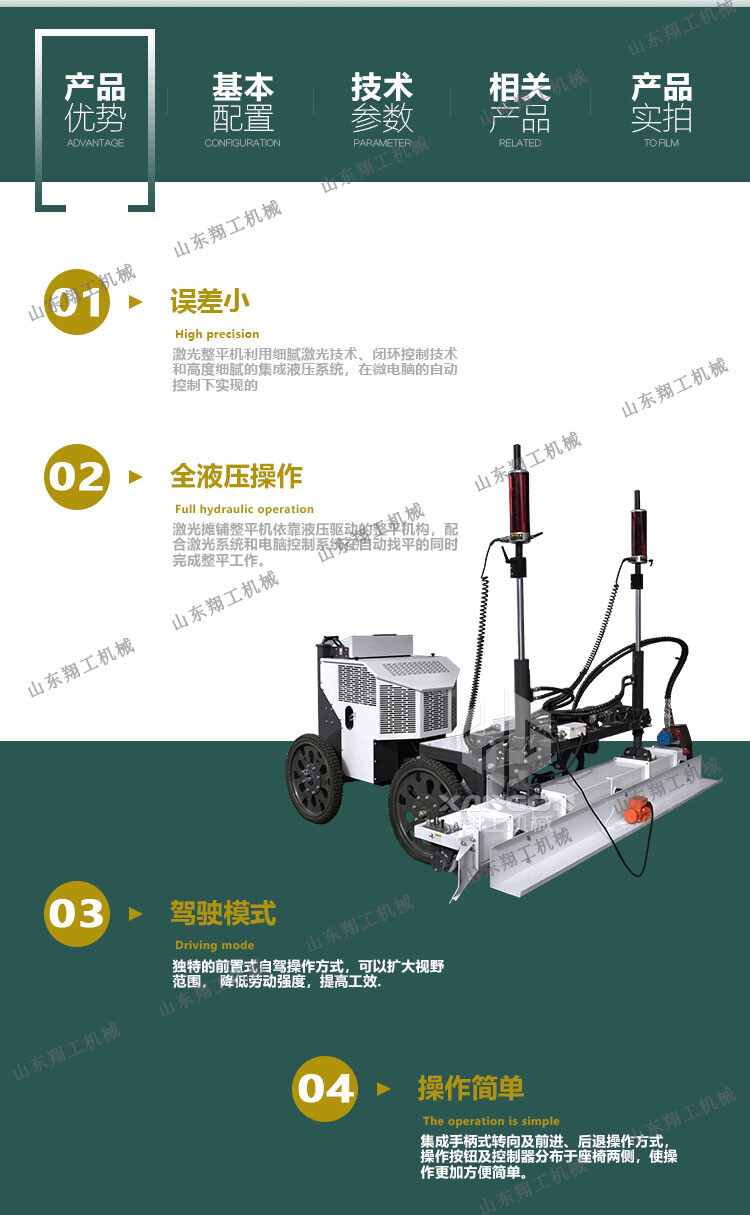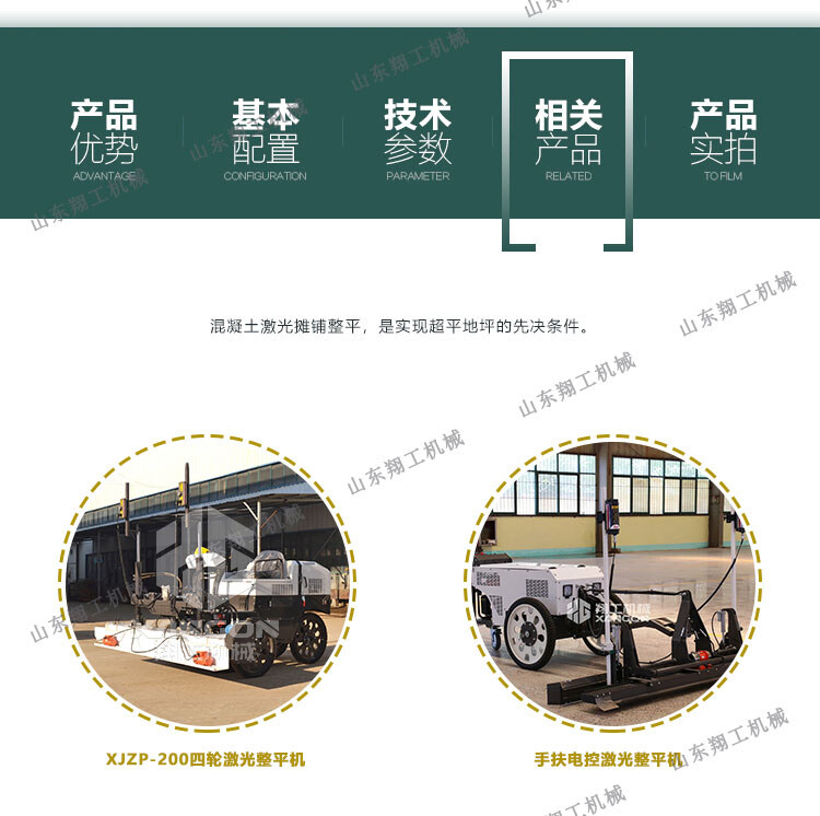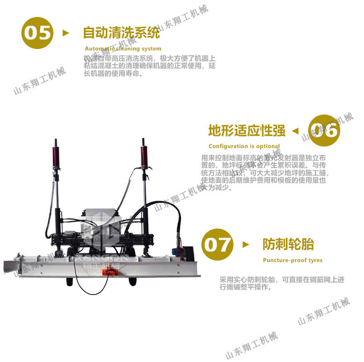 產(chǎn)品概述: 翔工機械精心研制開發(fā)的激光混凝土整平機利用先進的激光發(fā)射接收系統(tǒng)形成的閉環(huán)回路控制整平板尺的工作,精度高,廣泛用于現(xiàn)代工業(yè)廠房、大型購物場所、貨倉及其它大面積混凝土地面施工。